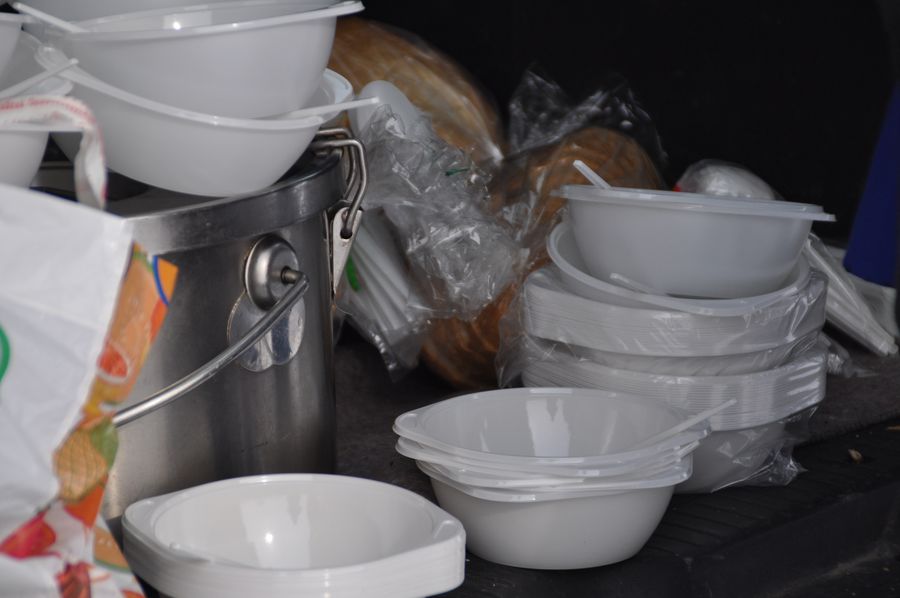 Az önkormányzat által kialakított Ady Endre úti krízisközpontban már 12 óra előtt sorba álltak a mai gulyáslevesért, ami mellé friss kenyér is járt. Ott jártunkkor tele volt az épület. Nem volt ez másképp a temető mögötti részen sem, ahol több tucatnyian dobozzal a kezükben várták az Ökumenikus Segélyszervezet munkatársait. Az ÁNTSZ épp akkor tartott ellenőrzést, amikor a helyszínen jártunk.