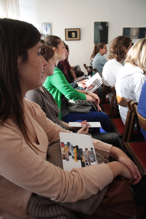 Az iskolai keretekhez igazított, 45 perces előadáson mindkét művész izgalmas részleteket árult el az alkotás folyamatáról, műhelytitkairól. „Jól éreztem magam az előadás közben, nem gondolom, hogy a fiatalokat nehezebb lekötni, mint az idősebbeket.” – mondta el Málik Irén, aki hozzátette: „Az üzenet az volt: szeressétek a textilt.” A Ferenczy Noémi-díjas textilművész előadását történeti korok és jellemző vonásaik bemutatása köré építette fel. A végzősök a szövetek, kárpitok jellegzetességei mellett érdekes információkat hallhattak a textilművészet fejlődéséről is.