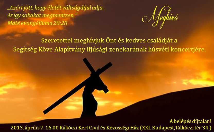 A Segítség Köve Alapítvány szeretettel meghívja Önökett és kedves családjukat ifjúsági zenekarának húsvéti koncertjére.