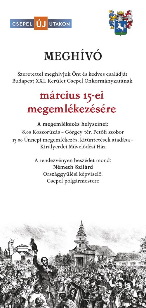 Szeretettel meghívjuk Önt és kedves családját Budapest XXI. Kerület Csepel Önkormányzatának március 15-ei megemlékezésére.