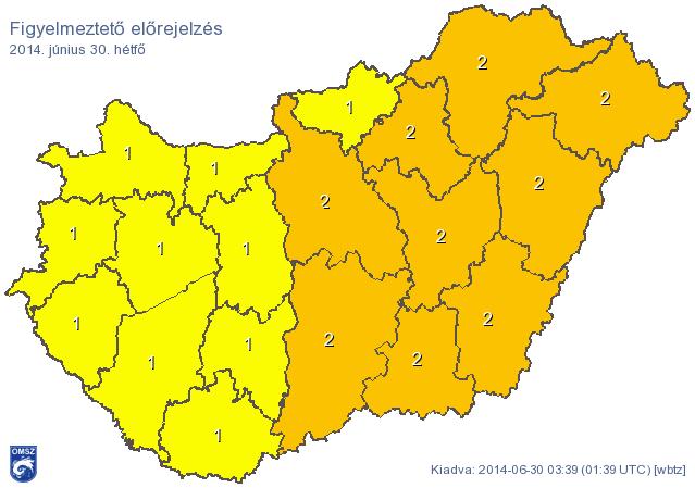 A várható heves zivatarok miatt Békés, Borsod-Abaúj-Zemplén, Csongrád, Hajdú-Bihar, Heves és Jász-Nagykun-Szolnok megyére másod-, Baranya, Bács-Kiskun, Nógrád, Szabolcs-Szatmár-Bereg, Tolna és Pest megyére, valamint Budapestre elsőfokú figyelmeztetést adtak ki. Ezeken a területeken károkozó szél, illetve jégeső is kísérheti a heves zivatarokat.