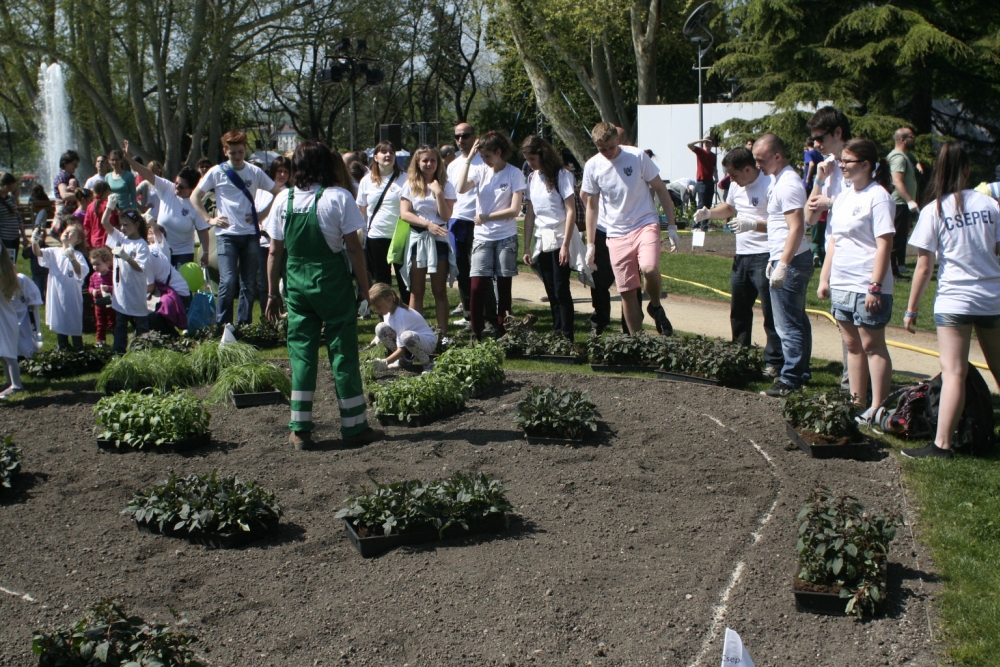 A Fővárosi Önkormányzat és a Főkert Zrt. immár harmadik alkalommal rendezte meg egész napos környezetvédelmi rendezvényét a Margitszigeten. A rengeteg program mellett rekordkísérletben is részt lehetett venni: összesen mintegy tizenháromezer tő növényt ültettek el önkéntesek, köztük harminc csepeli fiatal a szökőkút körüli területen. A sokadalomban könnyen fel lehetett ismerni őket a csepeli címerrel díszített egyen pólójukról.
