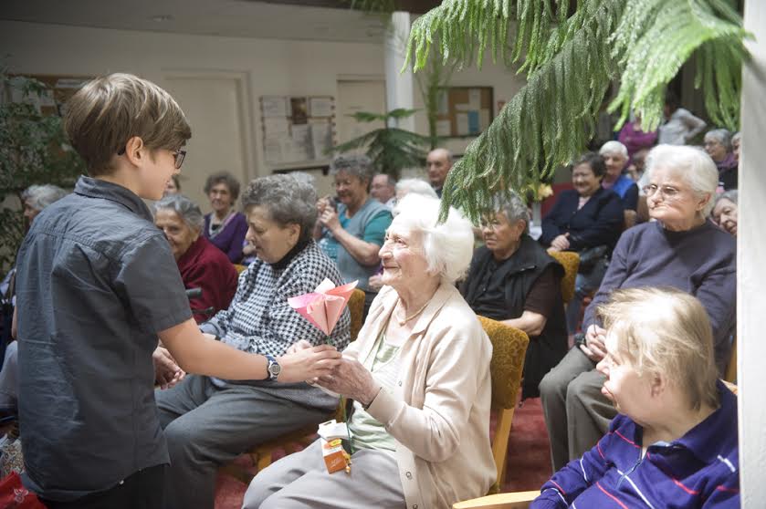 A diákok zenés irodalmi műsort adtak, majd egy-egy szál saját készítésű papírvirágot adtak át a szépkorú asszonyoknak.