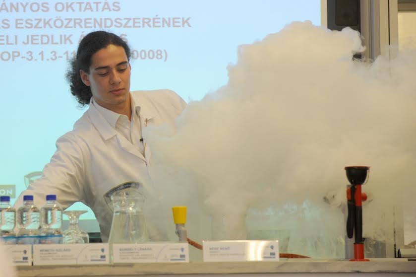 Takács Attila laborvezető fizikai, kémiai és biológiai kísérleteket mutatott be tanárkollégái közreműködésével. Elmondta, hogy mintegy ötszáz laboreszköz, 25 számítógép áll rendelkezésre, és hatszáz különféle kísérletet tudnak bemutatni.
