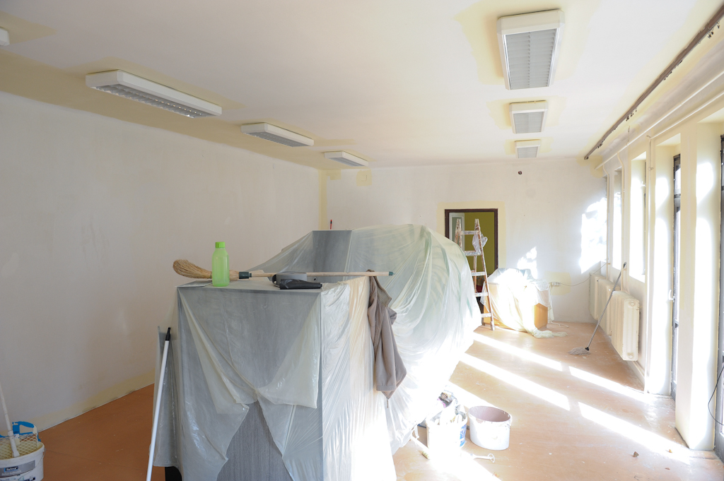 A HSZI munkatársai korábban előkészítették a terepet, leszedték a tapétát, glettelték a falakat, így csak a festés maradt hátra. Az épületben már csak ez a két helyiség várt felújításra, ahol jelenleg 26 időskorú nappali ellátását látják el.