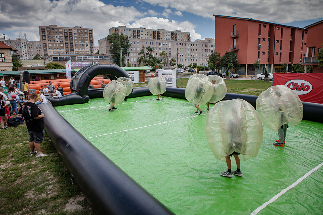Hát lássuk csak! Lehetett lézerharcot vívni, amelyben két csapat küzdött egymással. Játékpuskákkal lövöldöztek úgy, hogy a kijelző jelezte, mikor volt találat. A harcosok közben terepszemléztek, fedezékbe vonultak, mint egy igazi háborúban – de ez játék volt. Odébb buborékfoci volt napirenden. A játékosok luftballonra emlékeztető gömbökbe bújtak, úgy próbálták meg rugdosni a labdát. Kimerítő ütközetek folytak a sok eséstől és keléstől, mert könnyen lehetett hanyatt esni, bukfencezni. Az élőcsocsó ismertebb játék: gyerekek álltak be a csocsó terepre, és a számukra megszabott szűk területen kellett beügyeskedni a labdát az ellenfél kapujába. Ez is elég fáradságos mulatság. Népszerűnek bizonyult a sebességmérő kapu: itt azt mérték, hogy a vállalkozó kedvűek mekkora erővel képesek megrúgni a labdát. Komoly vetélkedés és erőfitogtatás alakult ki a fiúk között. Különféle számítógépes játékokat is bemutattak, és kipróbálhattak az érdeklődők. A nap végén díjazták a résztvevőket és a legjobbakat: nyerhettek sapkát, pólót, napszemüveget, fej- és fülhallgatót, tornazsákot.