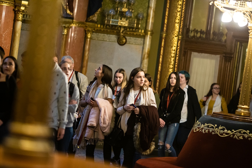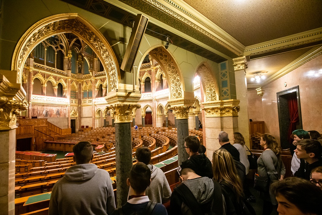 Az épület központi része a kupolaterem, amelynek a két oldalán találhatók az üléstermek. Az Országgyűlés az egykori alsóházi teremben tartja az üléseit. A diákok a karzaton tekinthették meg és hallgathatták az Országgyűlés munkáját, amint képviselők szóltak hozzá egy témához. Ezt követően az Országgyűlési Könyvtárba vezetett az út. Itt 700 ezer kötetet őriznek, ebből 40 ezer darab kézi könyvtár. A nyilvánosság számára a könyvtár nem kölcsönöz, a könyvek és folyóiratok helyben olvashatók és fénymásolhatók. Az olvasóteremben egyszerre százharmincan foglalhatnak helyet. Az olvasók rendelkezésére számítógépek állnak és biztosított a wifi szolgáltatás. A diákok parlamenti látogatása azzal zárult, hogy mindenkit megvendégeltek egy ebéddel.