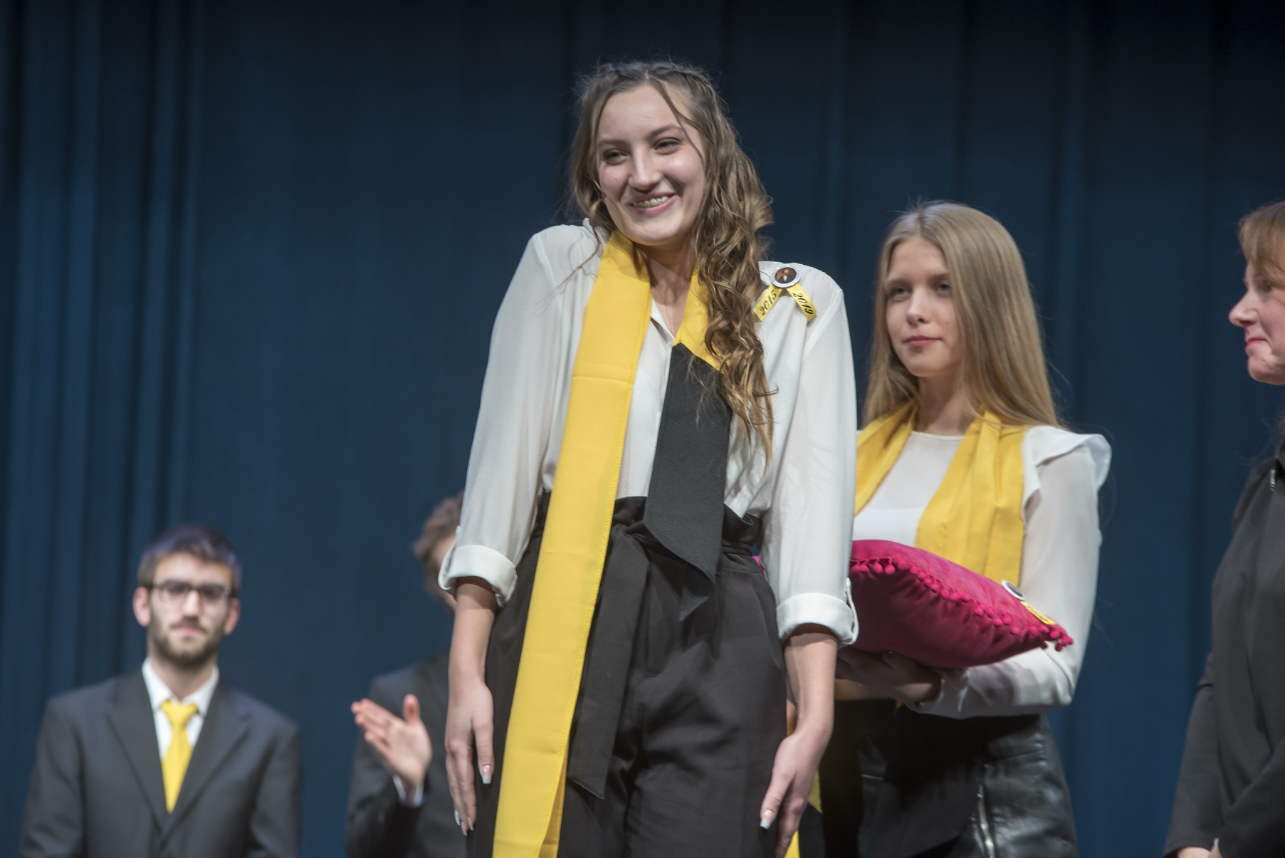 Ezután a hagyományok szerint Kolláth Enikő osztályfőnök feltűzte tanítványainak a szalagokat.