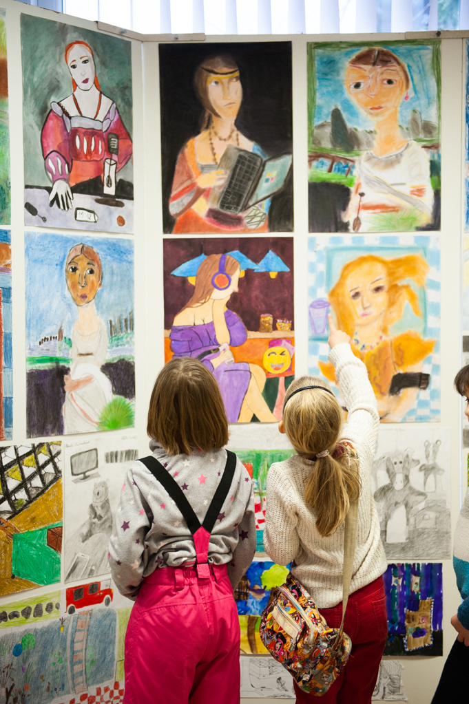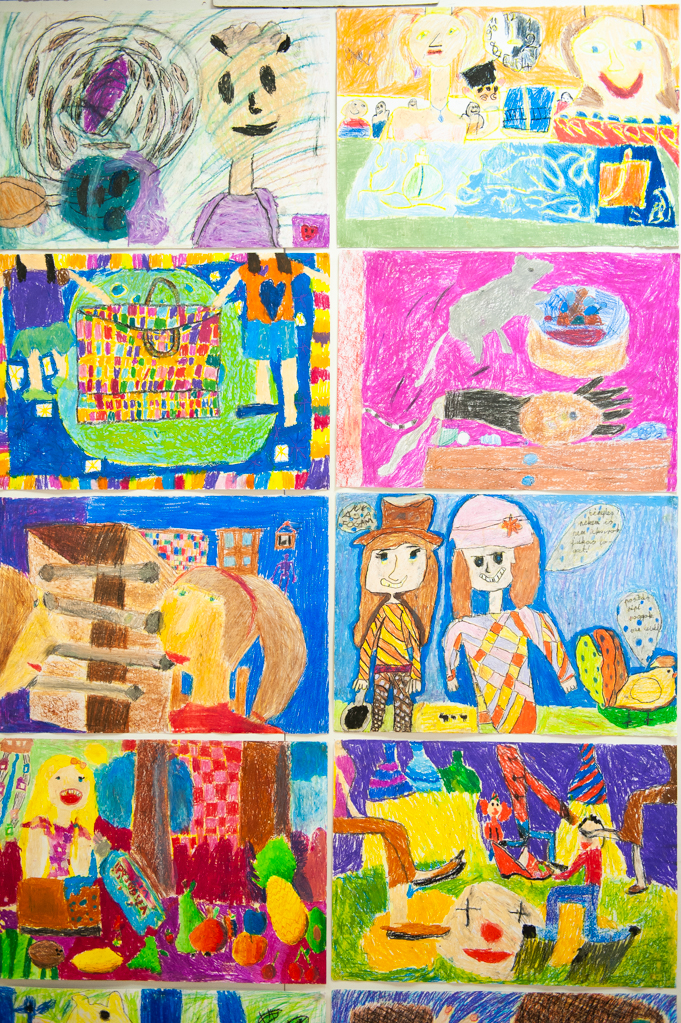 Ezután Geisbühl Tünde kalauzolt végig az alkotásokon, bemutatta a sok színes kép létrejöttét. Elmondta: a paravánokon többek között találkozhatunk szénrajzokkal, grafitrajzokkal, monotípiákkal, visszafogott akvarellképekkel, mozaikokkal, csendéletekkel, amelyek mesélnek alakokról, tárgyakról, állatokról és kalózhajókról is.