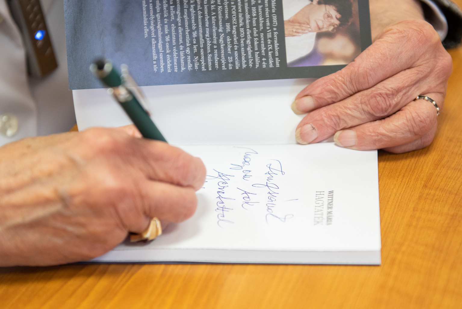 A könyvbemutatón Wittner Mária az október 23-ai Békemenetre készített saját gondolataival hímzett vászonszalagot adott át Borbély Lénárd polgármesternek.