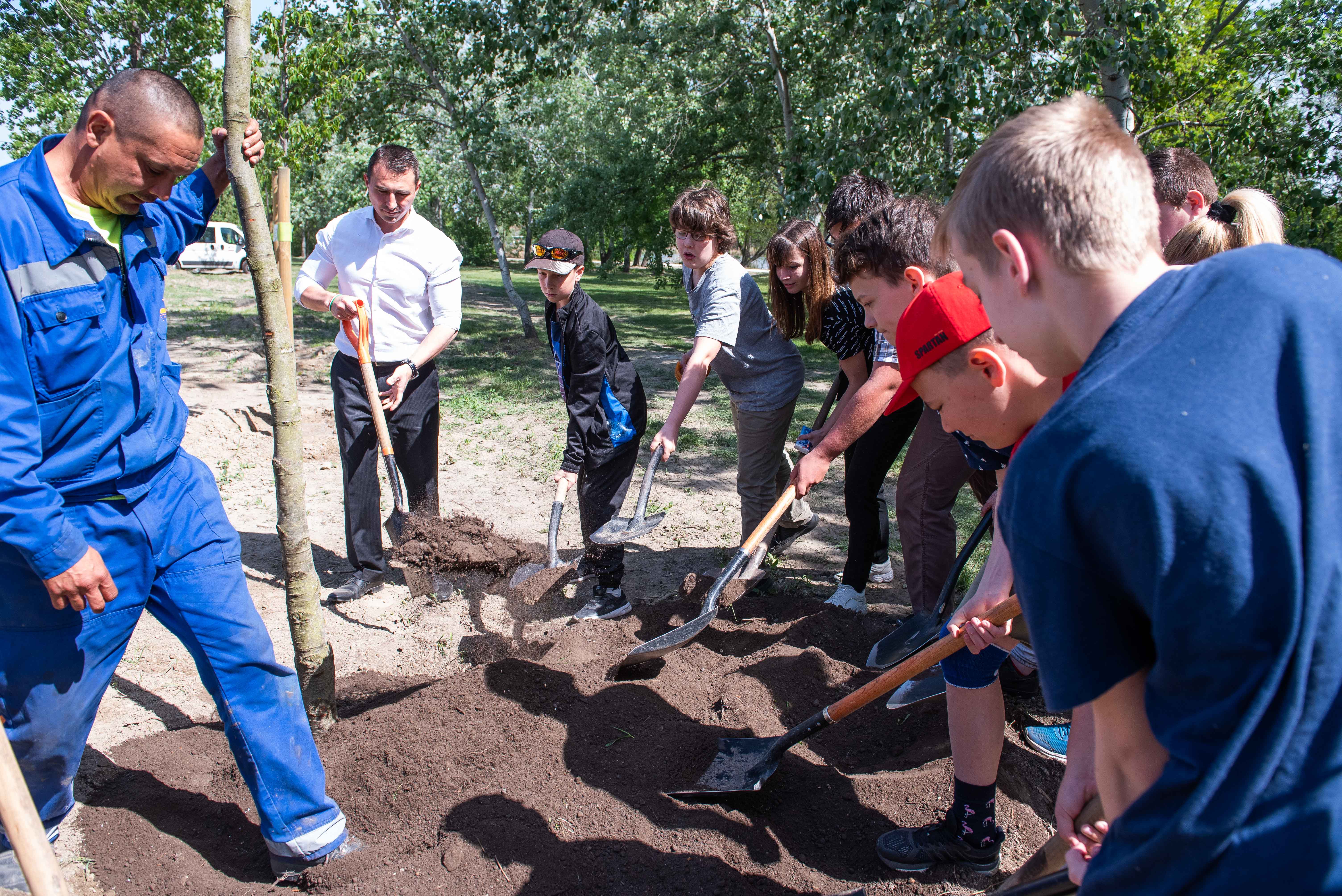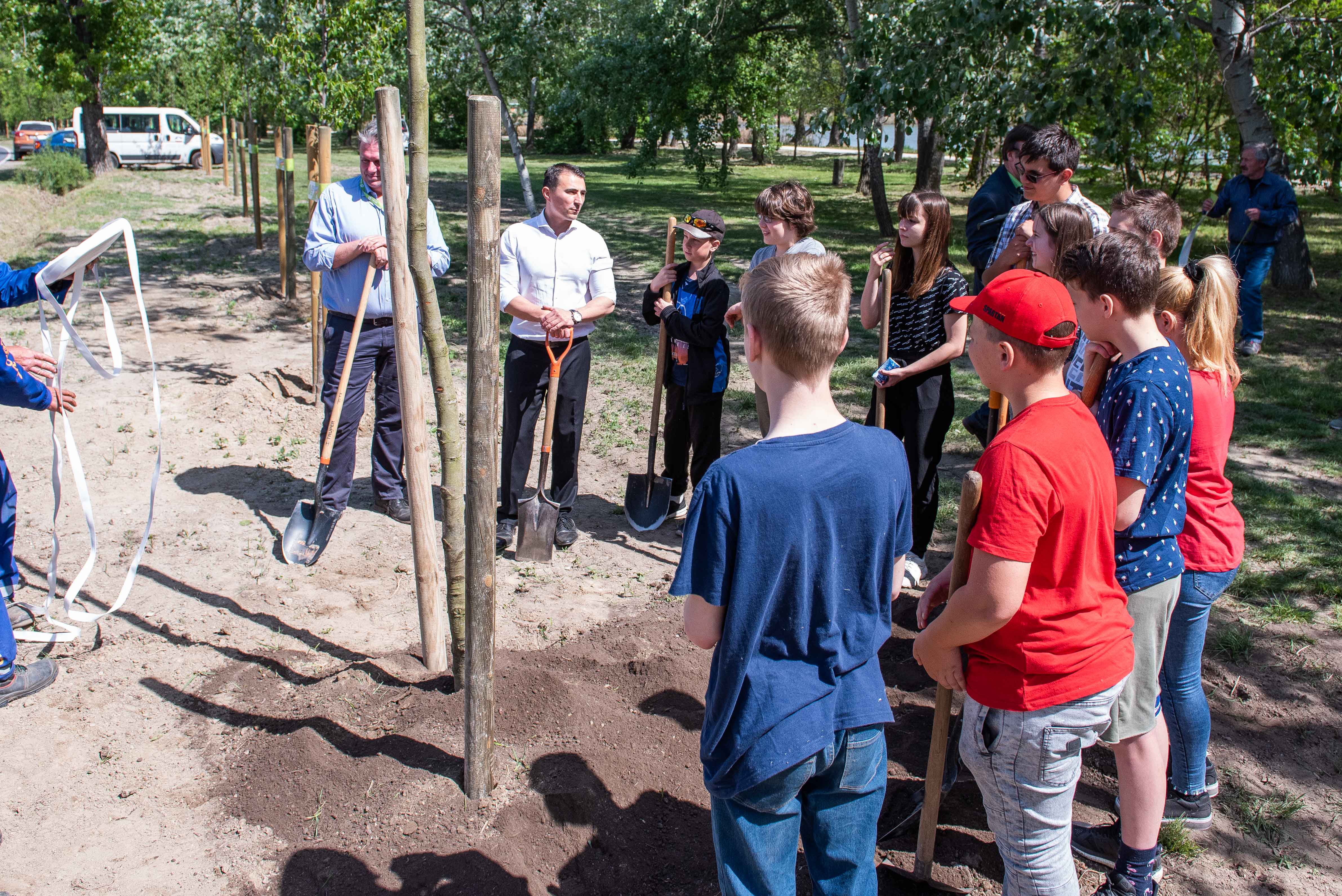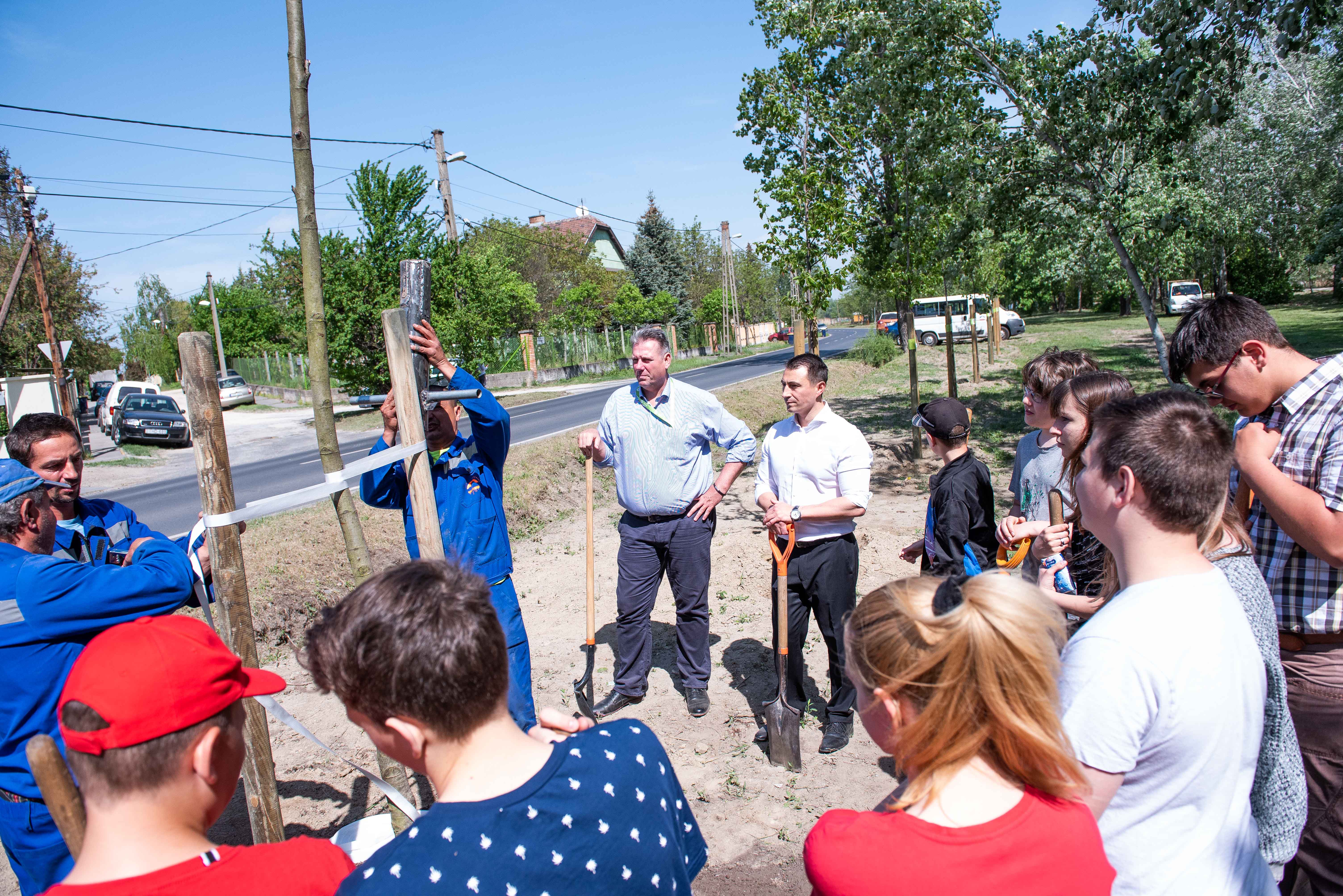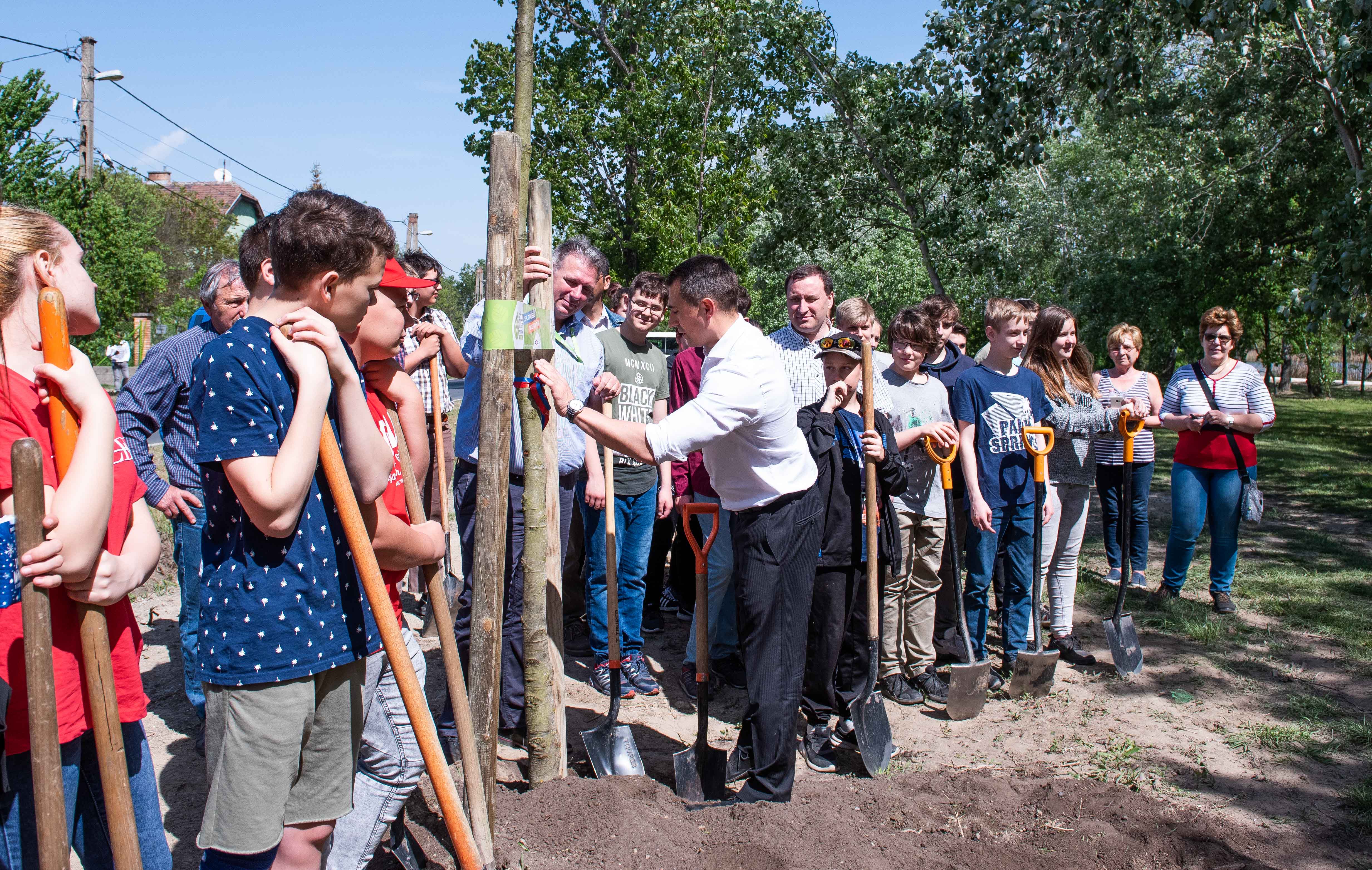 A facsemetéket Borbély Lénárd polgármester és Balogh Róbert a Főtáv munkatára a Szárcsa Általános Iskola 7-8. osztályos diákjaival közösen ültette el.