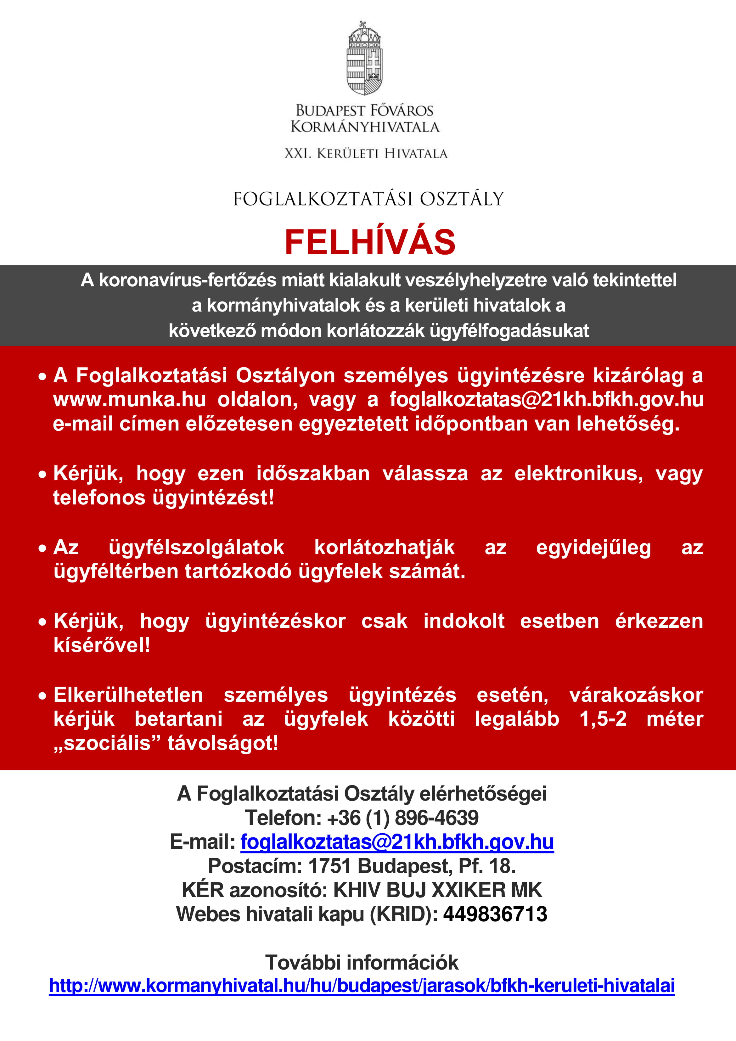 Változás a kormányhivatal Foglalkoztatási Osztályának ügyfélfogadásában