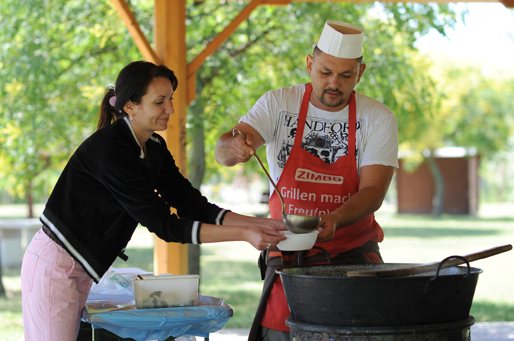 - Valóban ez a kifejezés illik rá a legjobban, hiszen a Tóth Ilona Egészségügyi Szolgálat dolgozói és a Humánszolgáltatások Igazgatóságáról- iskolaorvosok, az iskolafogászat és a kerületi védőnői szolgálat dolgozói- jöttek el ma családostól, hogy egy kicsit elbeszélgessenek és ismerkedjenek egymással. Ez megtörtént, mert hála a szép időnek, a jó társaságnak „keveredés” volt az osztályok dolgozói között. Azt hiszem ez a közel száz ember nagyon jól érezte magát köszönhetően az önkormányzat két remek „szakácsa”- Boldizsár István és Kuczbel András-, által főzött marhagulyásnak, valamint a Humán Szolgáltatások Igazgatóságához tartozó élelmezési csoport által készített finom süteményeknek és túrógombócnak.
