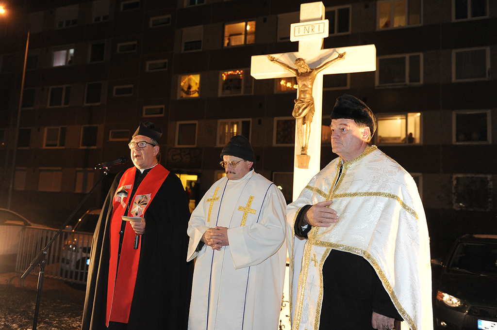 Csepel két nagy kőkeresztjét tavaly újíttatta fel az önkormányzat, most a harmadik átadása oda került, ahol a legnagyobb szükség van rá, a tízemeletes panelházak között, a LIDL áruházzal szemben. Ezen a környéken régóta nincs már feszület.