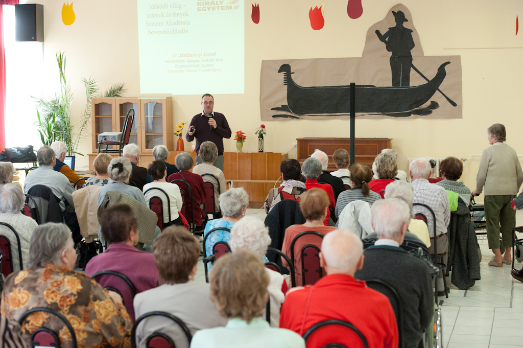 Az első előadás keretében Dr. Jászberényi József kultúrtörténész, tanár, gerontológiai kutató előadásában meggyőzően érvelt az élethosszig tartó tanulás, szellemi és fizikai aktivitás élethosszabbító hatása mellett, illetve statisztikai adatokkal is alátámasztotta érvelését. A Zsigmond Király Egyetem felnőttképzési igazgatója, aki 2009 óta szervezi és vezeti az egyetem senior képzését, hangsúlyozta továbbá, hogy mennyire fontos az élethosszig tartó tanulás, információszerzés.