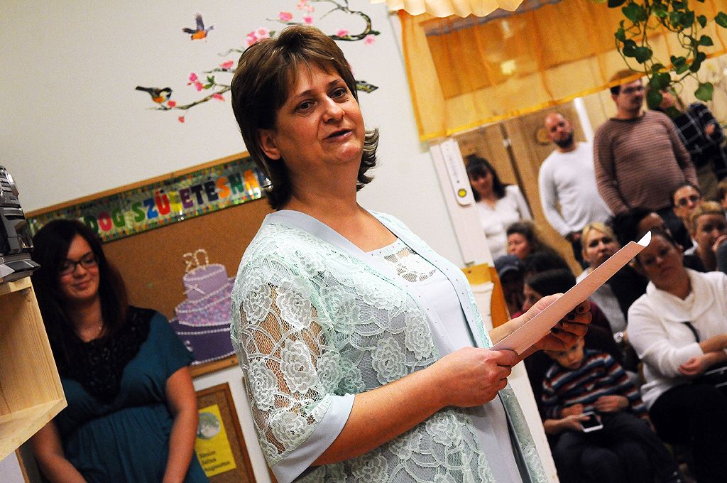 A továbbképzések támogatásáért köszönetet mondott Borbély Lénárd polgármesternek, és a lehetőség megteremtésért Hierholczné Faragó Tünde intézményvezetőnek. Beszédében kitért az óvoda egyik büszkeségére, a tankertre, amiért 2015-ben a Virágos Magyarországért országos környezetszépítő versenyben való kiemelkedő teljesítményük elismeréseként oklevelet vett át a Pesti Vigadóban az Emberi Erőforrások Minisztériumától.