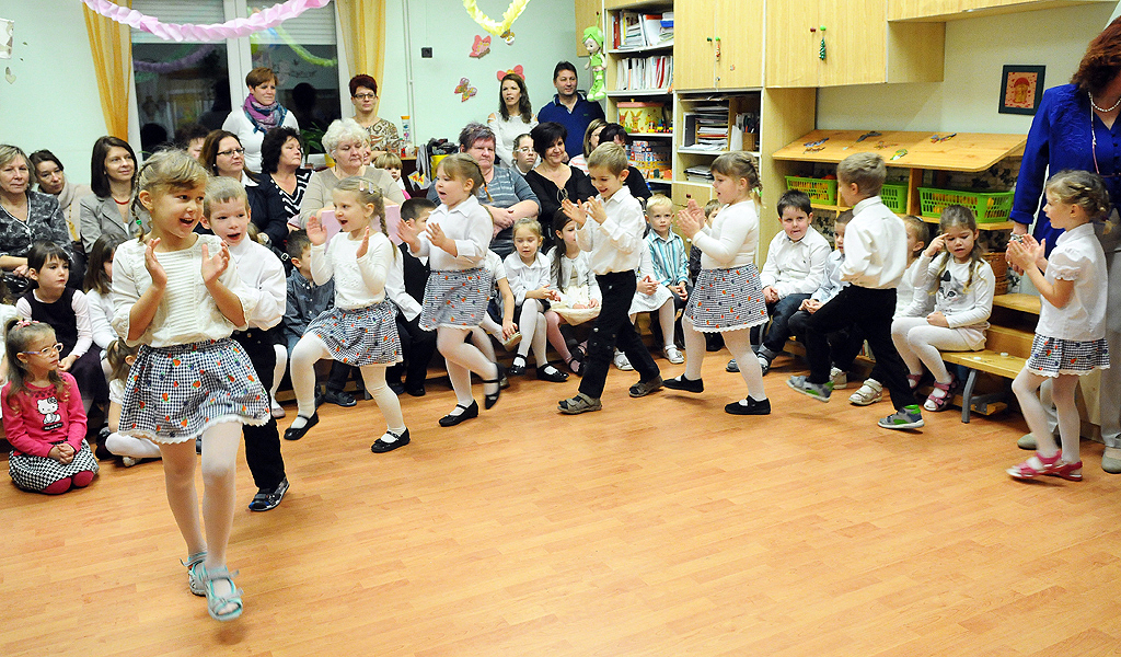 A születésnap alkalmából ünnepi műsorral készültek a kicsik, őszi verscsokrot adtak elő, énekeltek, mondókáztak Márton-napról.
