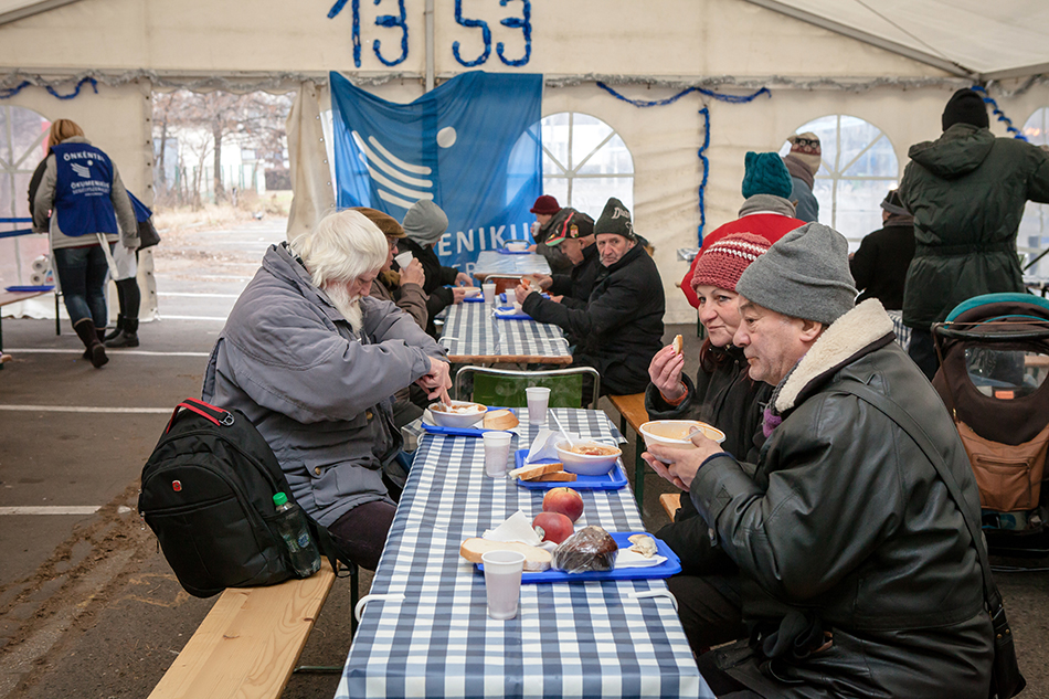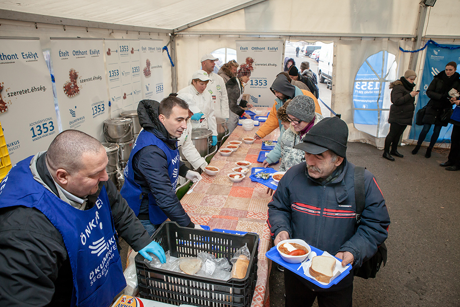 Az Ökumenikus Segélyszervezet önkéntesei december 23-ig naponta ezer adag étellel várják a szociálisan rászoruló embereket. Minden nap más cég munkatársai segédkeznek az ételek kiosztásában. Kedden az Elmű / Émász, szerdán az EON, csütörtökön a Vodafone, pénteken a MÖSZ dolgozói vesznek részt a vendéglátásban. Naponta 11 órától fogadják az érkezőket, s valamennyi alkalommal más lesz a menü.