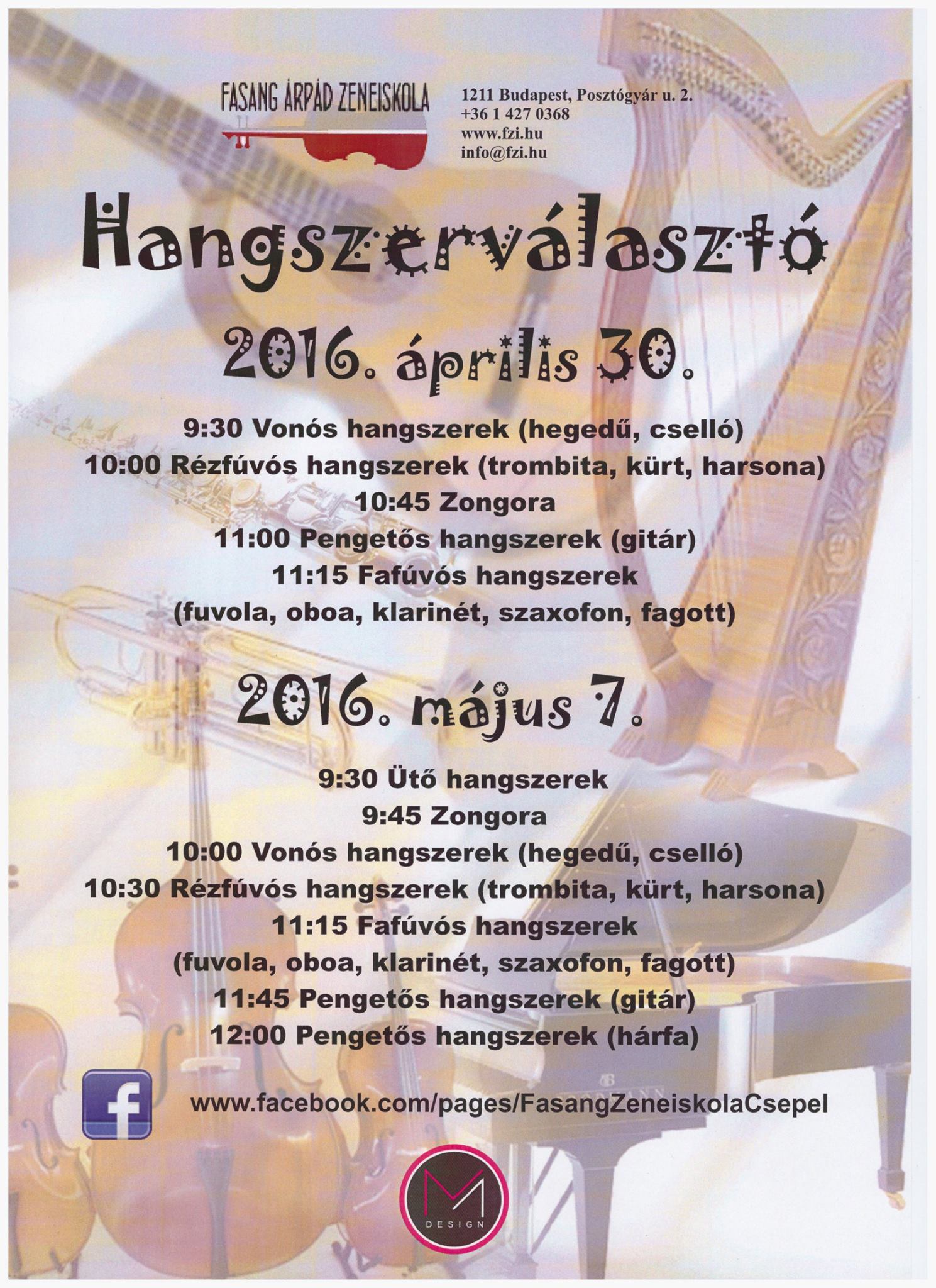 A zenei pálya iránt érdeklődőket hangszerválasztó napokra várják a Fasang Árpád Zeneiskolában április 30-án és május 7-én. Az intézménybe felvételizők szabadon megismerkedhetnek a vonós-, rézfúvós-, ütő-, pengetős- és fafúvós hangszerekkel, valamint a zongorával.