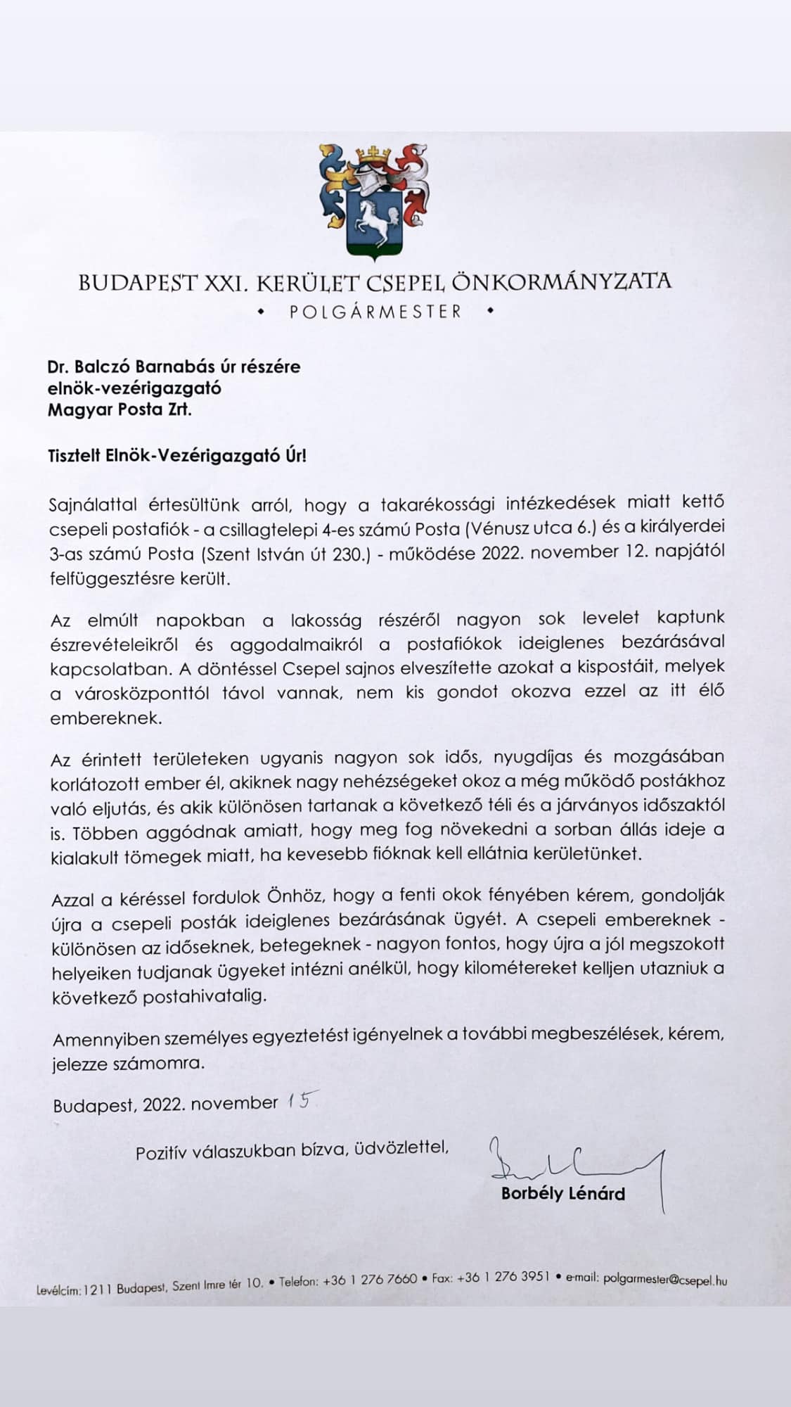 A csepeli kisposták ügyében személyes tárgyalást kezdeményezek a Magyar Posta új vezérigazgatójával. A csepeli embereknek - különösen az időseknek, betegeknek - nagyon fontos, hogy újra a jól megszokott helyeiken tudjanak ügyeket intézni anélkül, hogy kilométereket kelljen utazniuk a következő postahivatalig – írja Borbély Lénárd polgármester a közösségi oldalán.