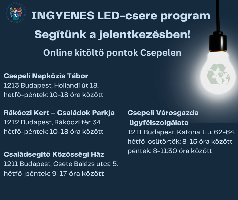 A csepeli önkormányzat támogatásával Budapesten elsőként Csepelen indult el a lakossági LED-csereprogram, amelynek keretében a jelentkezők meghatározott feltételek mellett ingyen juthatnak új, korszerű LED fényforrásokhoz.