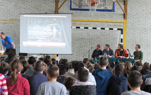 A szokásoknak megfelelően ezúttal is filmvetítéssel indult a program: először Vajda Attila nyári, duisburgi világbajnoki sikere elevenedett fel, majd Korisánszky Dávid ugyancsak Németországban kenu-négyesben elért bronzérmes futamát idézte fel a lejátszó, és Kiss Tamás Kozmann Györgyel elért csodaszámba menő pekingi olimpiai futamáról is láthattak képkockákat a diákok. Természetesen közben rengeteg dolog kiderült a sportolókról: hogy mikor és miért éppen a kenuzás mellett tették le voksukat, milyen tanulók voltak, mennyi küzdelem, elszántság és kitartás szükségeltetik ahhoz, hogy kitűnjenek az egyre sűrűsödő nemzetközi mezőnyből.